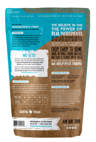 Lamb, Lamb Heart, Ground Lamb Bone, Lamb Liver, Lamb Kidney, Organic Spinach, Organic Broccoli, Organic Squash, Organic Pumpkin Seed, Organic Flax Seed, Organic Coconut Oil, Organic Dried Kelp, Krill Oil, Organic Alfalfa, Cod Liver Oil, Organic Parsley, Vitamin E Supplement.