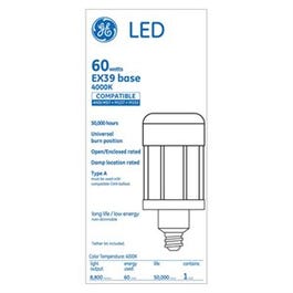Ge, led60/2m175/840, 60w, clear, non-dimmable, ed27, led light bulb, ex39 base, equivalent to a 175w multi-vapor metal halide, lumens: 8,800, color temperature: 4000 kelvins, mol: 8.4", rated life: 50,000 hours, rated for open or enclosed fixtures, rated for damp locations, boxed.